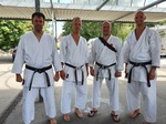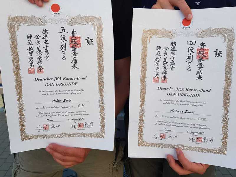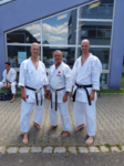 Zudem besteht auf diesem Lehrgang die einzige Möglichkeit in Deutschland sich einer Dan-Prüfung höher als dem 3.DAN unter den Augen von DJKB-Chiefinstructor Hideo Ochi (9.DAN) zu stellen. Nach erfolgreich bestandener Prüfung freuen sich Achim Stuff und Andreas Quast über ihren neu erworbenen Dan-Grad, und wurden dazu von Michael Eichert direkt vor Ort beglückwünscht, der nach seiner Prüfung im letzten Jahr „nur“ am Lehrgang teilgenommen hatte.