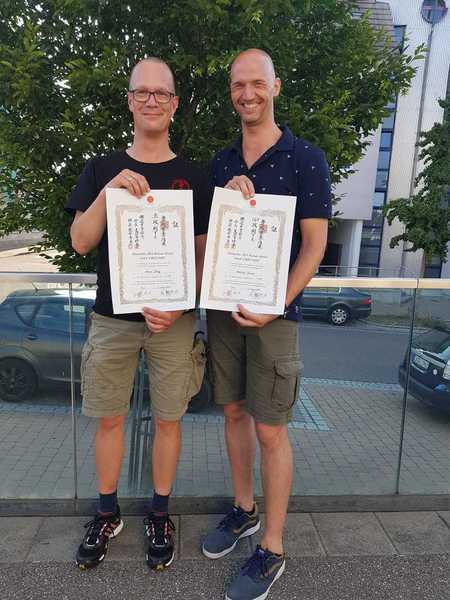 Am 07.09.2019 fand in Hennef ein Lehrgang mit DJKB-Chiefinstructor Hideo Ochi statt, an dem auch Mitglieder unseres Vereins teilnahmen. Die Möglichkeit zur Dan-Prüfung nutzen Andreas Niklas und Simon Henkel, beide langjährige Mitglieder unseres Vereins, dazu sich der Schwarzgurt/Dan-Prüfung unter den Augen des Chiefinstructors zu stellen. Nach einer körperlichen intensiven Überprüfung ihres Könnens, gratulieren wir beiden zur bestandenen Prüfung. Unser ebenfalls mitgereister Trainer Nikolas Schrage übermittelte die Glückwünsche des Vorstands - sowie des ganzen Vereins - und überreichte ihnen jeweils den Schwarzgurt.